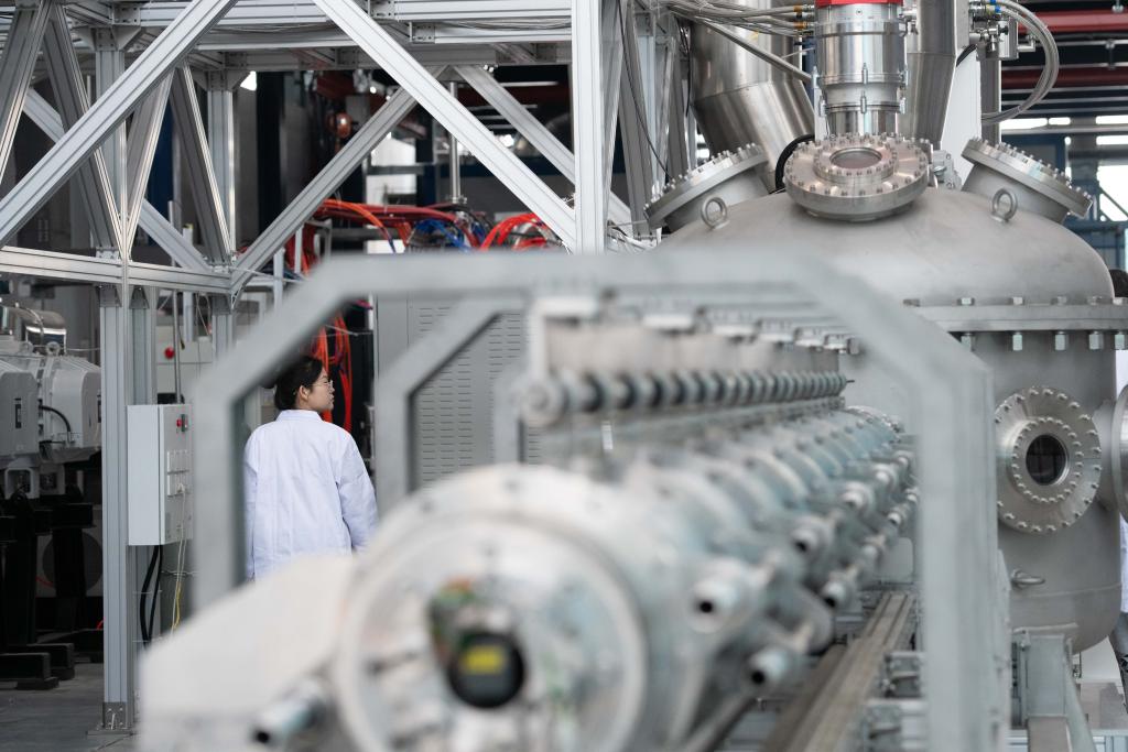 2025年1月14日,科研人員在巡看強(qiáng)流直線等離子體裝置“赤霄”的運(yùn)行狀態(tài)。新華社記者 張端 攝
