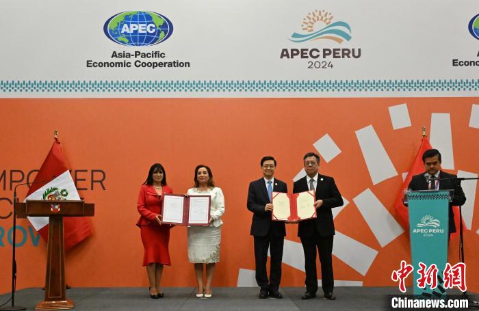 2024年11月15日,亞太經(jīng)合組織第三十一次領(lǐng)導(dǎo)人非正式會(huì)議期間,中國(guó)香港與秘魯在秘魯利馬簽署自由貿(mào)易協(xié)定。圖為秘魯總統(tǒng)博魯阿爾特(左二)、秘魯外貿(mào)旅游部部長(zhǎng)萊昂(左一)、香港特區(qū)行政長(zhǎng)官李家超(右三)、香港特區(qū)政府商務(wù)及經(jīng)濟(jì)發(fā)展局局長(zhǎng)丘應(yīng)樺(右二)完成簽署后合影。 香港特區(qū)政府新聞處供圖
