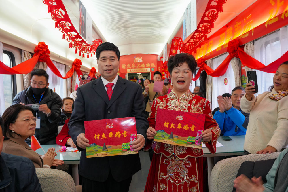 1月18日,一對(duì)金婚夫婦在5640次列車上舉行“村火車上的婚禮”。新華社發(fā)(龍建睿 攝)