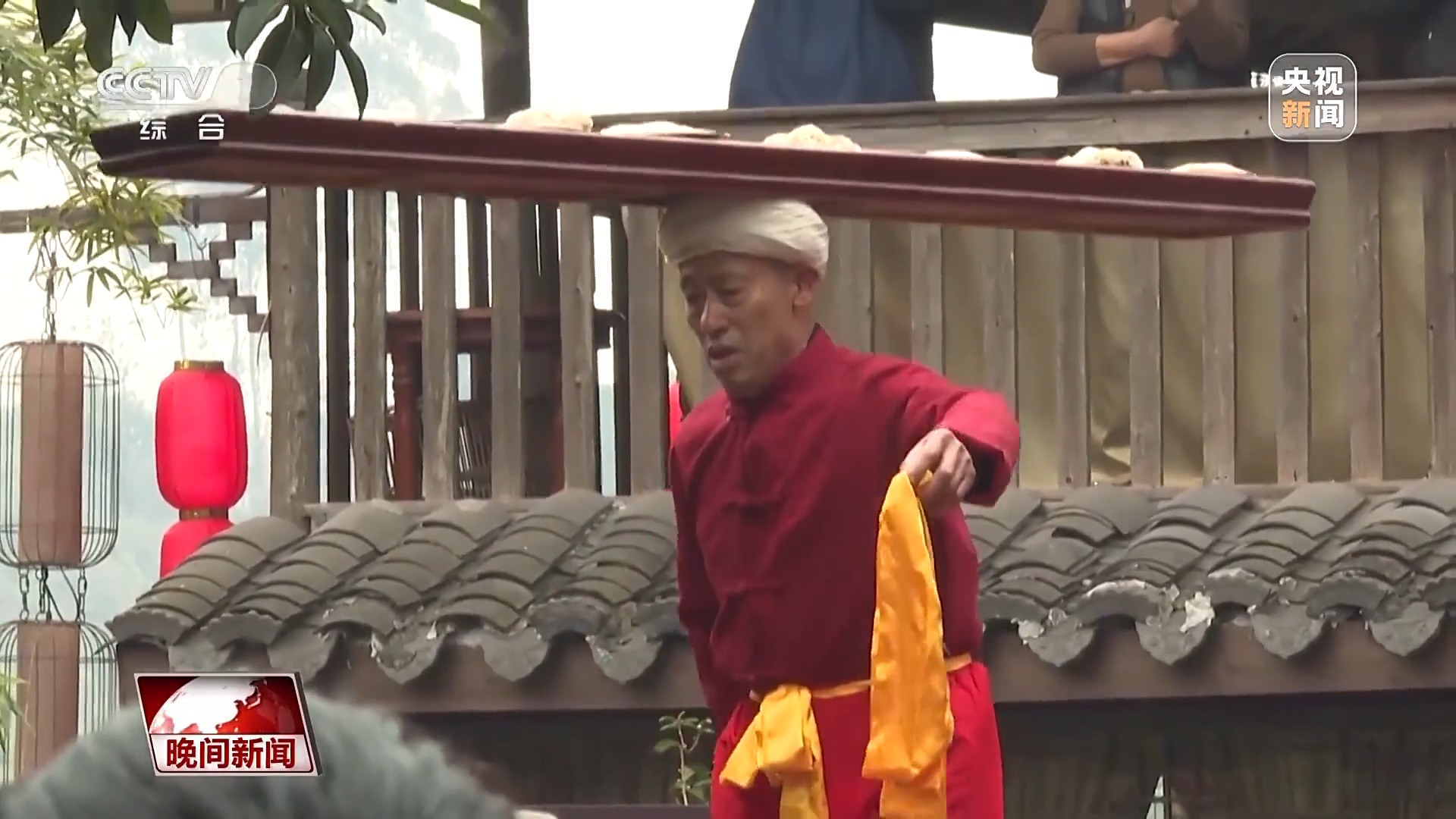 古鎮(zhèn)街道狹長,辦宴席時(shí)需要快速傳菜,于是便有了“打盆”這種獨(dú)特的上菜方式。在我們的左手邊,就有一位當(dāng)?shù)乩先苏诒硌荽蚺杞^技。
