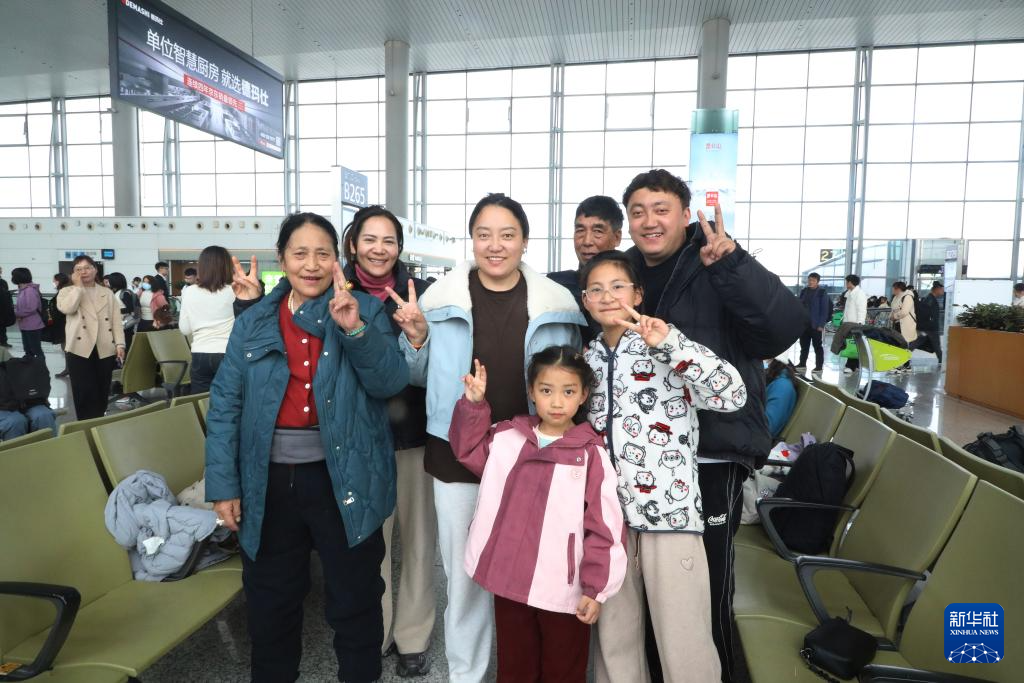 1月14日,斯郎倫珠一家人在廣州白云機(jī)場(chǎng)候機(jī)時(shí)合影。新華社記者 田建川 攝