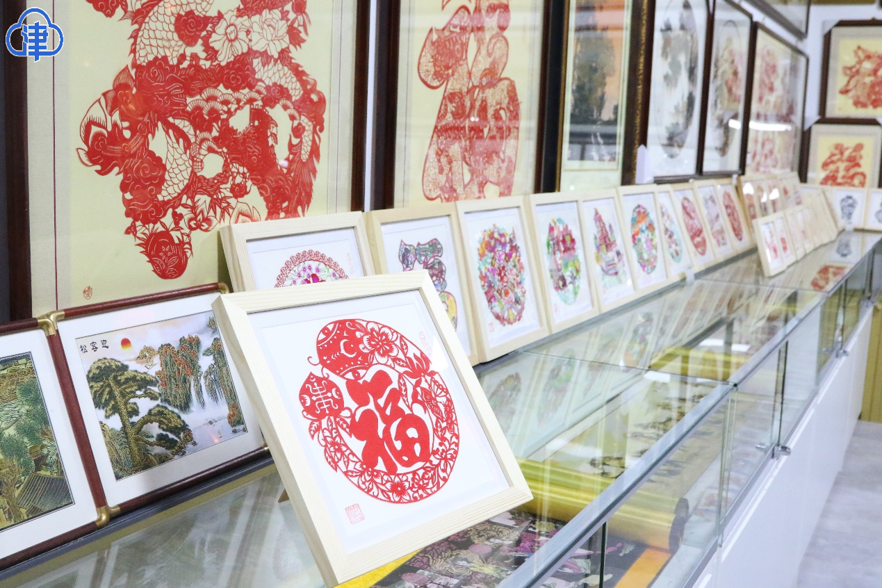 在戲樓對(duì)面,楊柳青剪紙世家第四代傳人,郝桂芬的剪紙鋪吸引了眾多游客的駐足。郝桂芬既是店鋪的“當(dāng)家人”,也是非遺剪紙項(xiàng)目的代表性傳承人。楊柳青剪紙的技法,既需要用北方剪刀剪出輪廓,又需要用南方刻刀雕飾細(xì)節(jié)。郝桂芬的獨(dú)門(mén)絕技——染色剪紙,是先用白紙剪出樣式,再用楊柳青年畫(huà)的技法上色。她的剪紙作品包括花鳥(niǎo)魚(yú)蟲(chóng)、神話故事、喜慶吉祥圖案等,深受游客喜愛(ài)。在這里,游客們不僅可以購(gòu)買(mǎi)到精美的剪紙作品,還能在學(xué)習(xí)體驗(yàn)剪紙技法,感受指尖上的古老藝術(shù)。