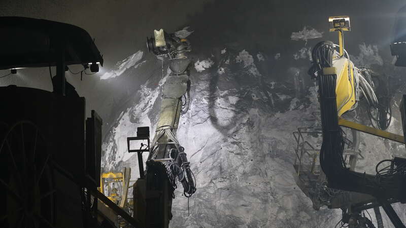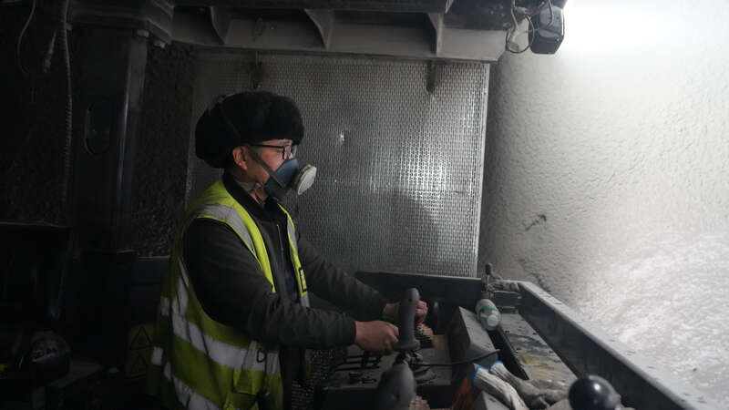 G219線昭溫公路(昭蘇至溫宿)西天山特長(zhǎng)隧道內(nèi),施工員操縱機(jī)器作業(yè)。中青報(bào)·中青網(wǎng)記者 陳曉/攝