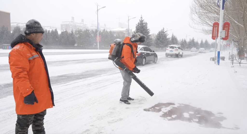 雪越下越厚,風(fēng)機(jī)已難以應(yīng)對(duì)。王師傅遞來(lái)一把鐵鏟說(shuō):“要注意,不要直來(lái)直去地鏟,而是要斜著發(fā)力,這樣一次能鏟更多雪,也不容易刮壞地面的紋路?!?/p>
