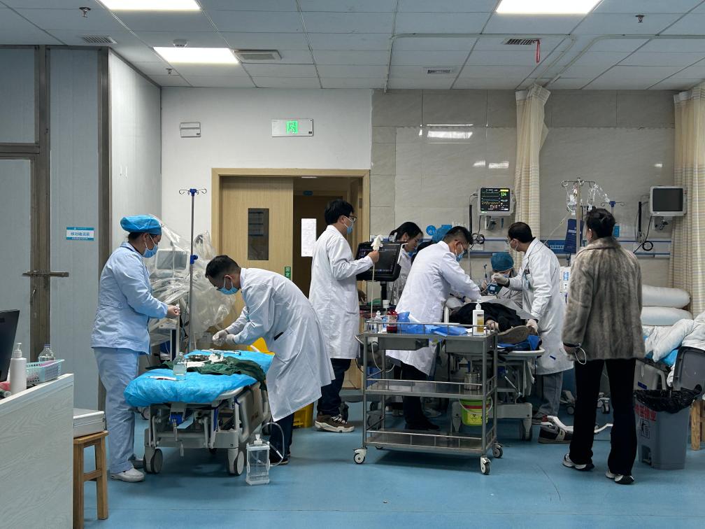 醫(yī)護(hù)人員正在搶救病人。新華社記者劉禎 攝