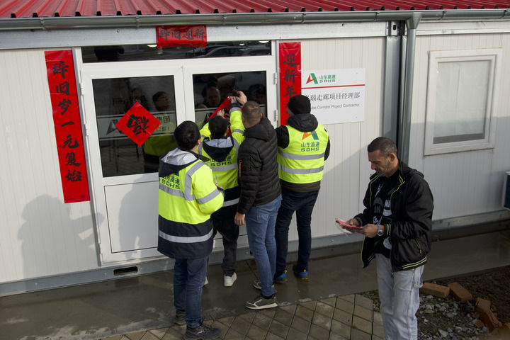 春節(jié)前夕,在塞爾維亞“多瑙走廊”快速路項(xiàng)目營(yíng)地上,中方工作人員與塞籍員工一起貼福字。新華社發(fā)(內(nèi)馬尼亞攝)
