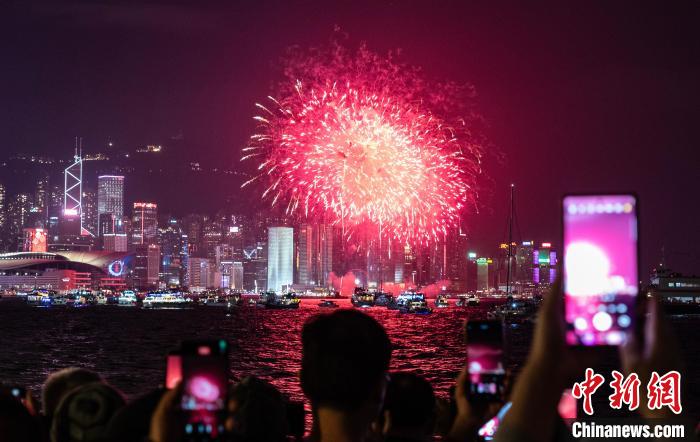 20時20分左右,煙花匯演進入終章《瑞蛇豐年》,在背景音樂《金蛇狂舞》聲中,“游星”煙花直奔夜空,形成“靈蛇狂舞”的壯觀景象。隨后,所有躉船將剩余煙花密集燃放,維港夜空霎時流光溢彩,與摩天大樓的現(xiàn)代夜景交相輝映。