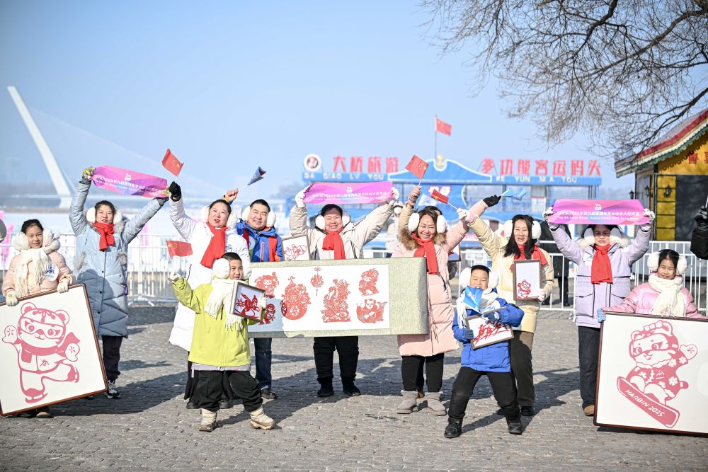 啦啦操、快閃合唱、街頭器樂演奏、國標(biāo)舞、冰雕制作……沿途,豐富多彩的群眾活動(dòng)營造出滿滿氛圍感。在五星紅旗的掩映下,濱洲鐵路橋煥然一新,高校大學(xué)生置身大型亞冬會(huì)主題畫框,合唱《我和我的祖國》,留下精彩一瞬。