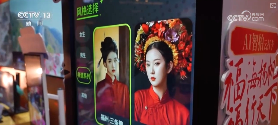 夜幕降臨,一場(chǎng)新春科技大秀在福州市的冶山春秋園上演了。泉州的簪花是福建文旅的頂流,在現(xiàn)場(chǎng),一臺(tái)AI旅拍機(jī)吸引了許多游客排隊(duì)體驗(yàn)。只要拍攝一張照片,就可以利用AI一鍵生成“簪花圍”造型,還能輕松在各種非遺裝扮之間來(lái)回切換。