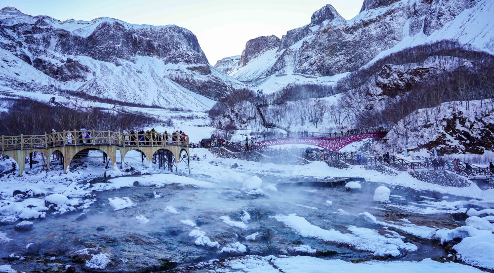 長(zhǎng)白山天池以北的延邊州,溫泉室外的樹枝上覆滿積雪,泡池內(nèi)滾燙的地?zé)嵩丛床粩?。伸出腳尖觸水,一股暖意傳遍全身。延邊云集安圖火山泉、龍井氟溫泉、延吉低氘溫泉等多種特色溫泉,吸引海內(nèi)外眾多游客慕名而來。