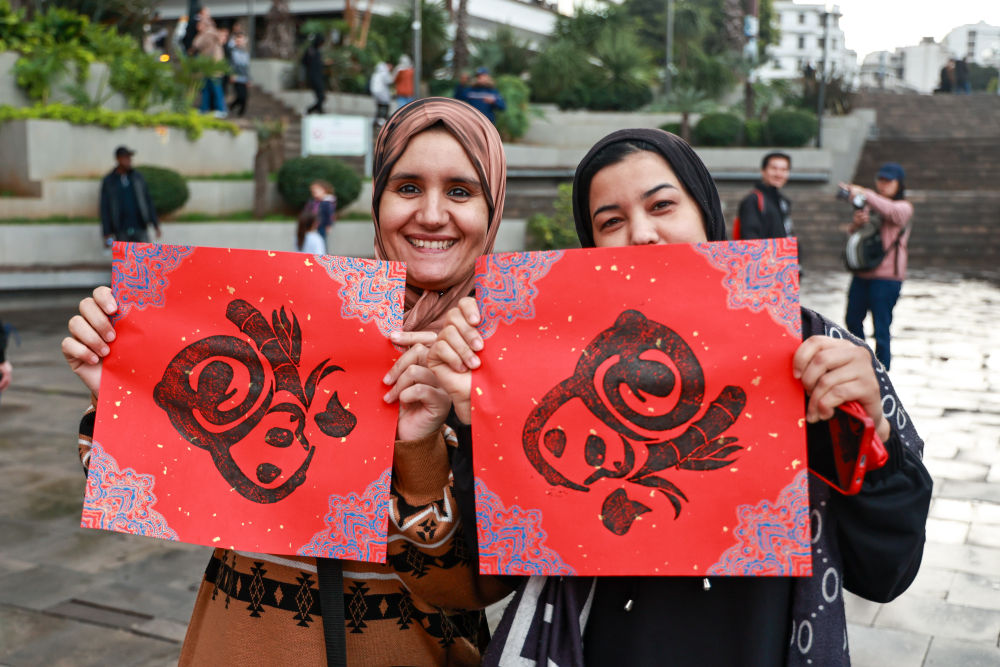 1月17日,在摩洛哥卡薩布蘭卡的“中國廟會”活動現(xiàn)場,摩洛哥民眾展示印有中國農(nóng)歷蛇年主題圖案的木版水印作品。新華社記者霍晶攝