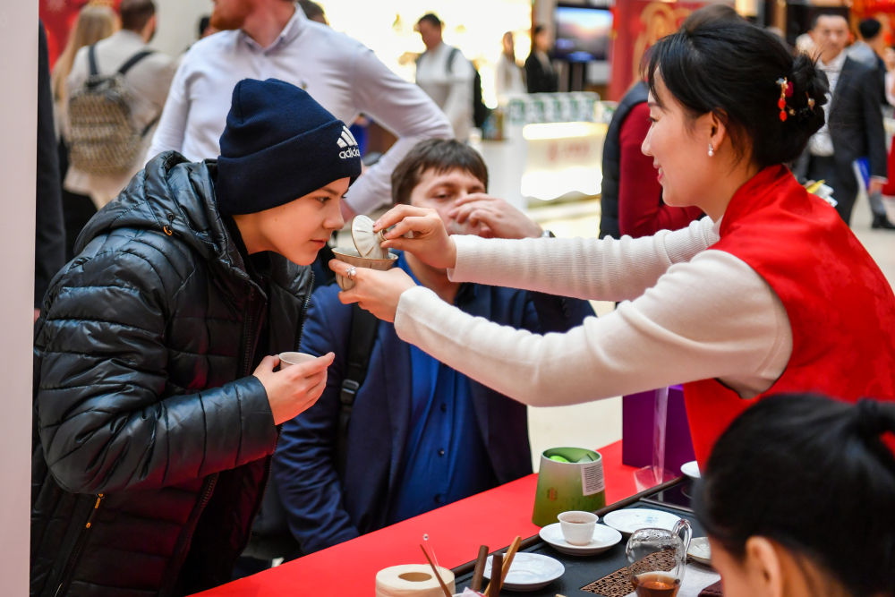 1月28日,在俄羅斯莫斯科舉行的新春廟會活動上,游客在感受茶文化。新華社記者曹陽攝