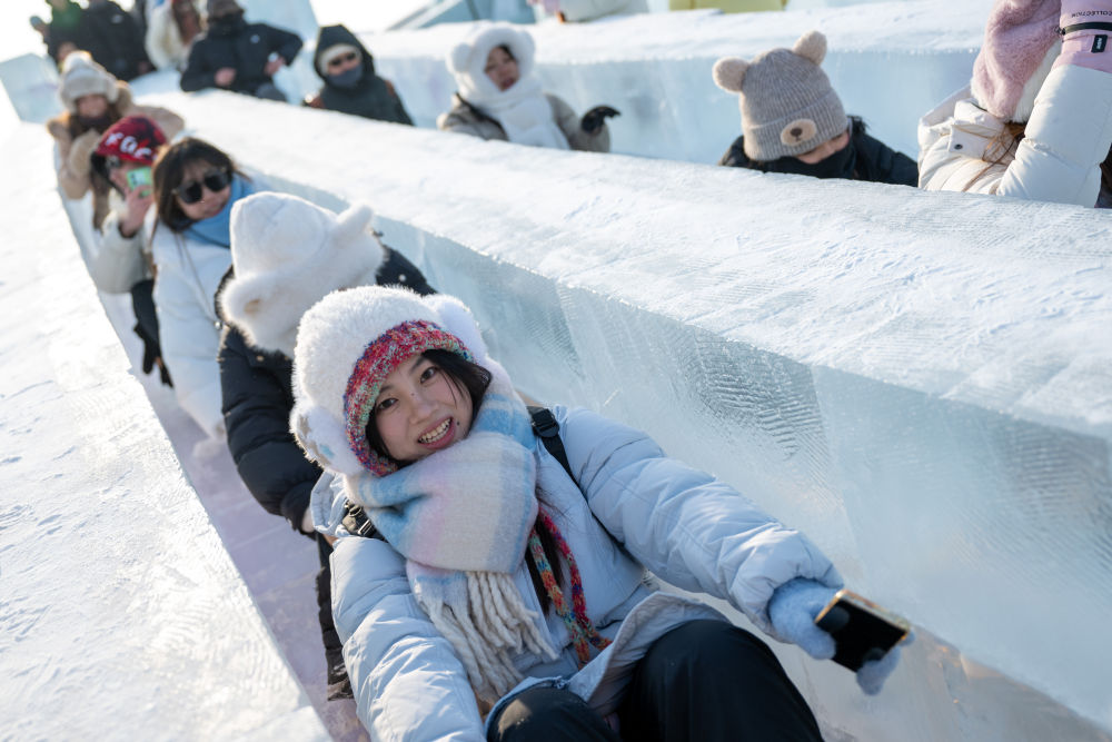 2024年12月21日,游客在哈爾濱冰雪大世界園區(qū)內(nèi)玩滑梯。