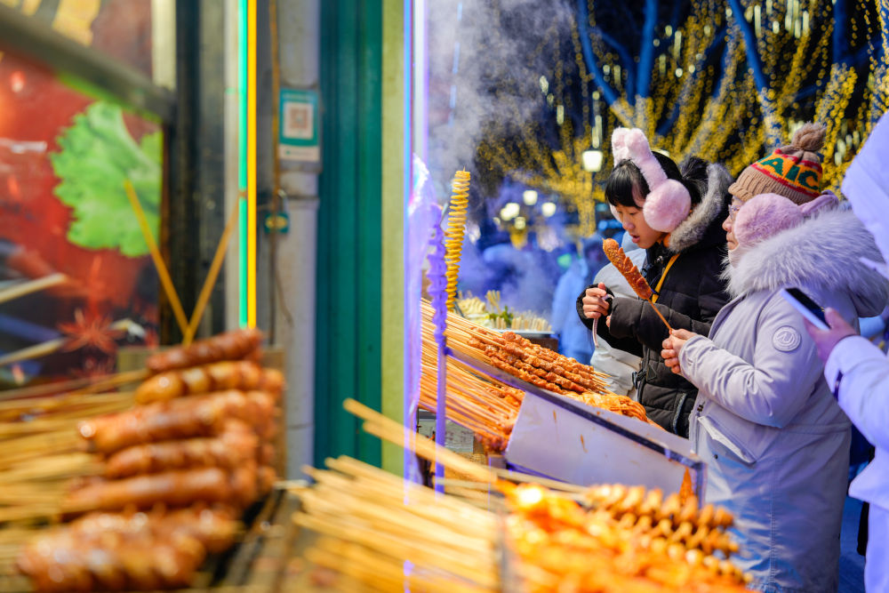2025年1月30日,游客在哈爾濱中央大街上品嘗烤腸。