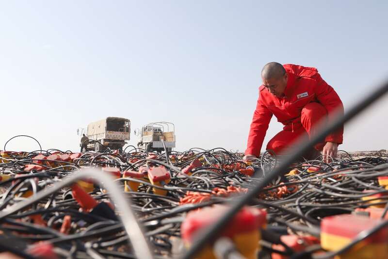 在施工現(xiàn)場,需要檢測的無線節(jié)點儀器和檢波器串?dāng)[成了一個巨大的圓形圖案,李國忠和物探隊員一起為這些儀器做“健康體檢”。李國忠介紹,無線節(jié)點儀器穩(wěn)定性高、便于攜帶,主要用在高難山體區(qū)。在沙漠區(qū)采用高精度可控震源,既保證了施工質(zhì)量、提高了施工效率,也保護了生態(tài)環(huán)境,實現(xiàn)了綠色勘探。