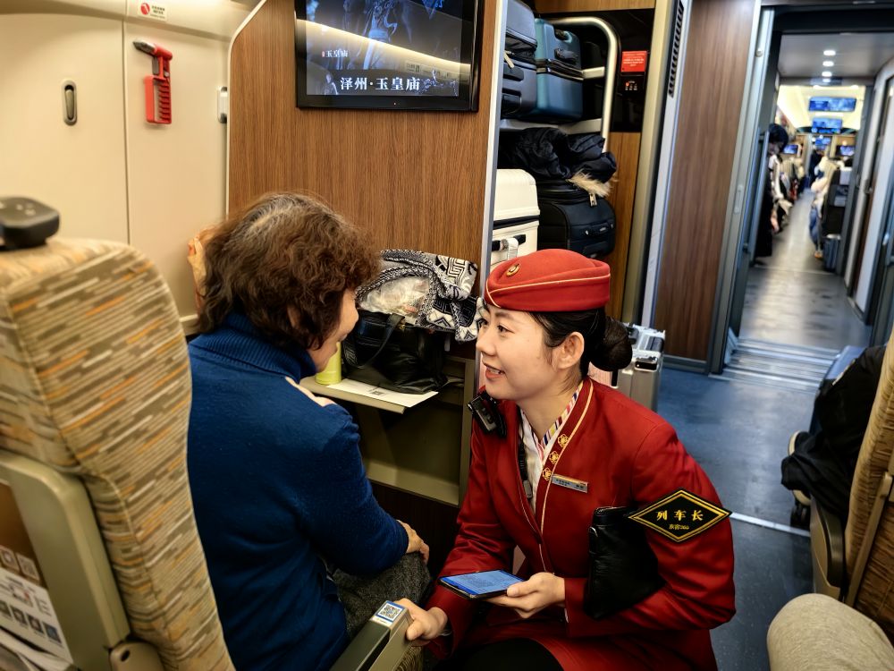 2025年1月25日,在北京開往上海的G9次列車上,列車長韓茹為一位獨自出行的老年旅客服務。新華社記者 翟翔 攝