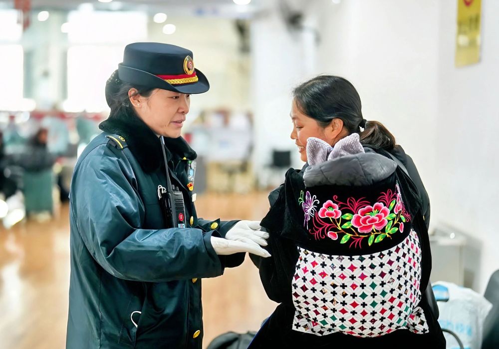 2025年1月29日,國鐵武漢局襄陽站客運員穆佟在為旅客服務。新華社發(fā)(劉娟 攝)