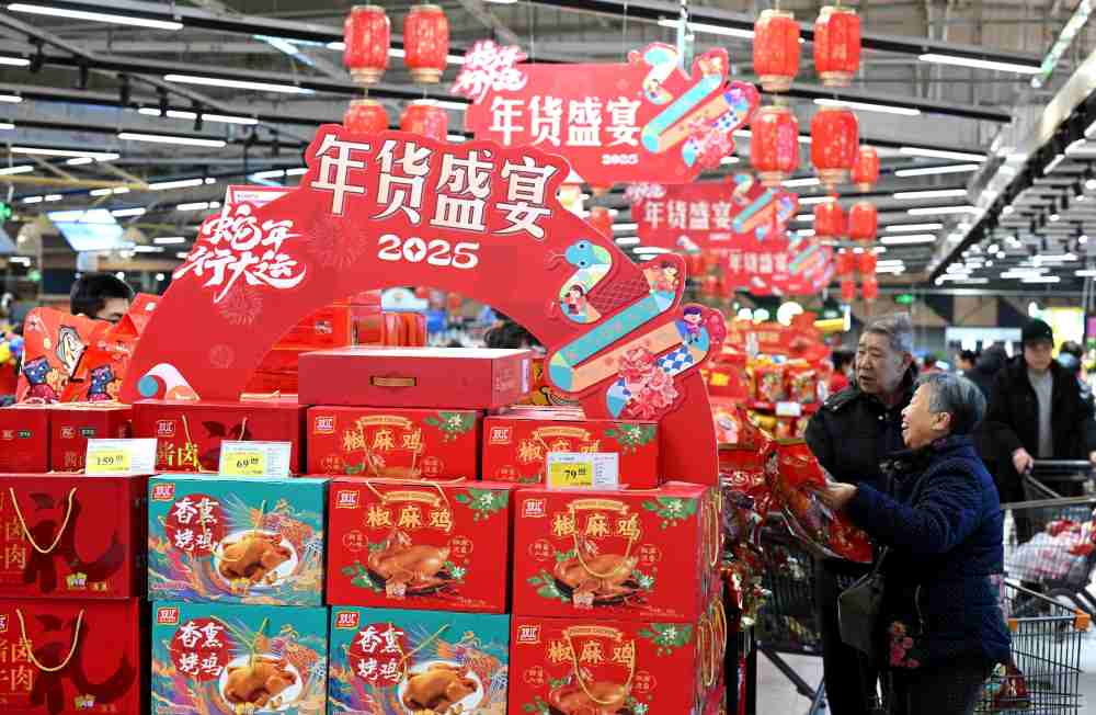 2025年1月24日,顧客在河北省石家莊市新華區(qū)北國超市中環(huán)店選購年貨。新華社發(fā)(陳其保 攝)