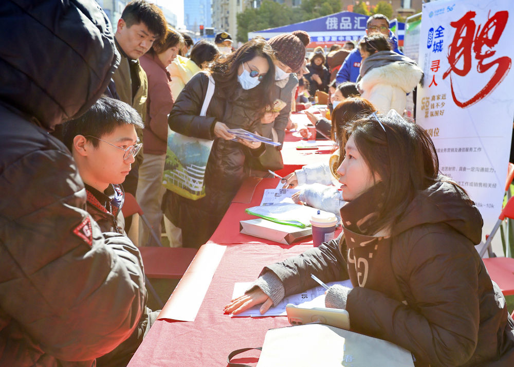 2月8日,求職者在南京市鼓樓區(qū)舉辦的“春風(fēng)行動(dòng)”專場(chǎng)招聘會(huì)上了解招聘信息。新華社發(fā)(蘇陽(yáng)攝)