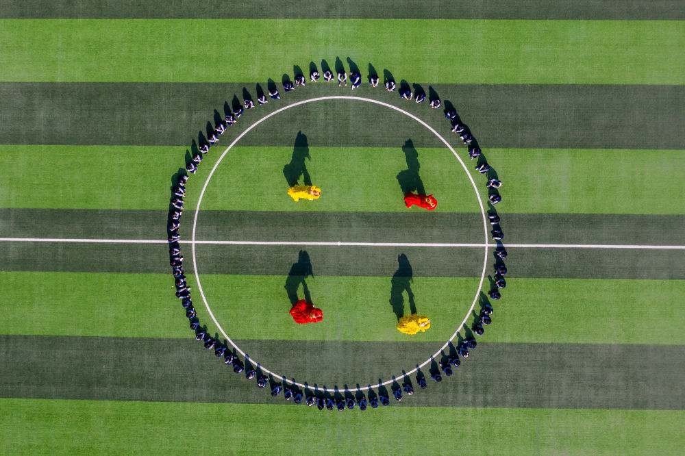 2月14日,山東省淄博科技學校龍獅社團的學生在操場上進行舞獅演練(無人機照片)。新華社發(fā)(張維堂攝)