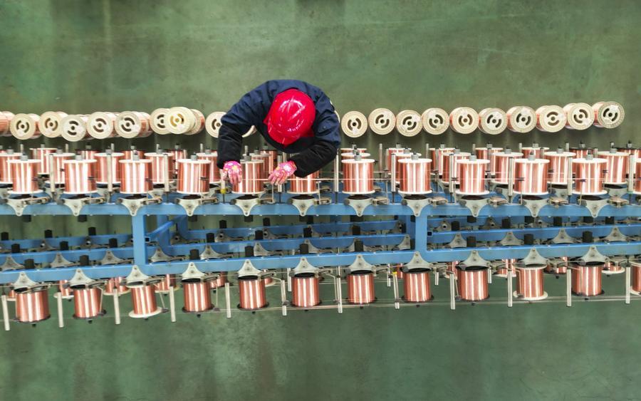 2月13日,在山東省東營(yíng)市廣饒縣李鵲鎮(zhèn)的一家電纜公司的生產(chǎn)車間內(nèi),工人在進(jìn)行束絲作業(yè)(無(wú)人機(jī)照片)。新華社發(fā)(劉云杰攝)