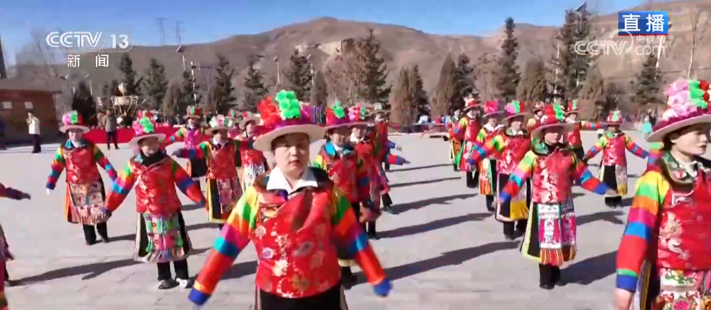 記者來到班彥村的村口廣場看到,三十多位土族姑娘和小伙子們身穿鮮艷的民族服飾,手挽手肩并肩,跳起土族傳統(tǒng)舞蹈——安召舞,為即將到來的互助縣農歷“二月二”傳統(tǒng)擂臺廟會暨“非遺宣傳周”展示活動做準備。歡快的節(jié)奏真的是非常有感染力,每個人身上似乎都洋溢著火一般的熱情。