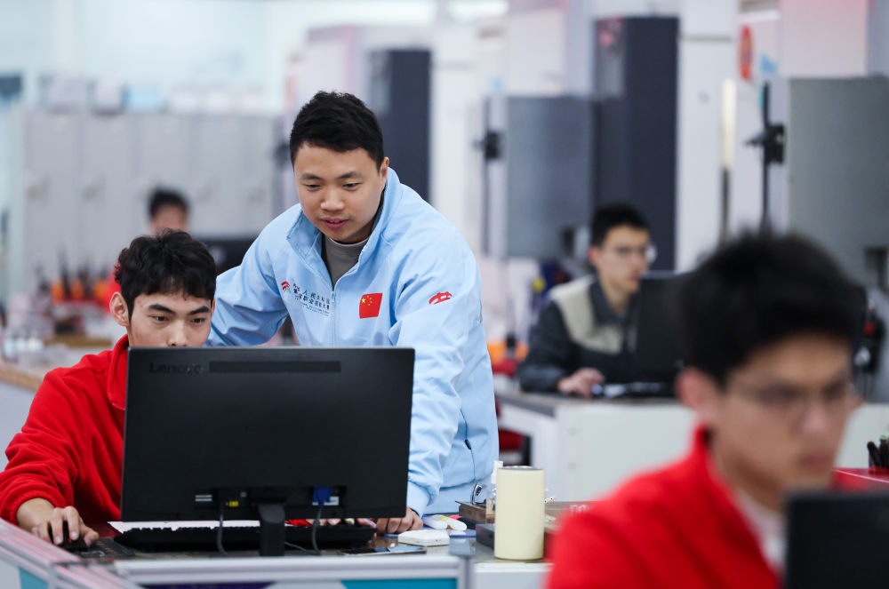 楊登輝(左二)指導(dǎo)學(xué)生對器件數(shù)控銑加工進行程序編程。