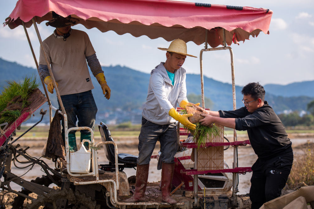 多年生稻科技小院的學(xué)生(右一)幫助當?shù)剞r(nóng)民一起插秧。