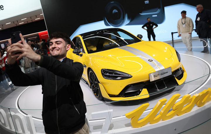 2025年3月6日,在西班牙巴塞羅那舉行的2025年世界移動(dòng)通信大會(huì)上,一名男子和小米汽車合影。新華社記者 趙丁喆 攝