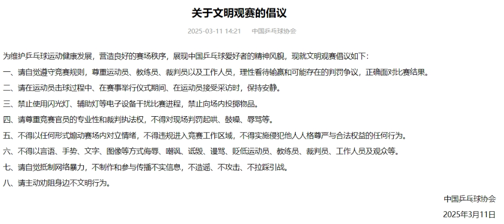 中國乒乓球協會11日在官網發(fā)布《關于文明觀賽的倡議》,其中提到理性看待輸贏、抵制網絡暴力等八項內容。