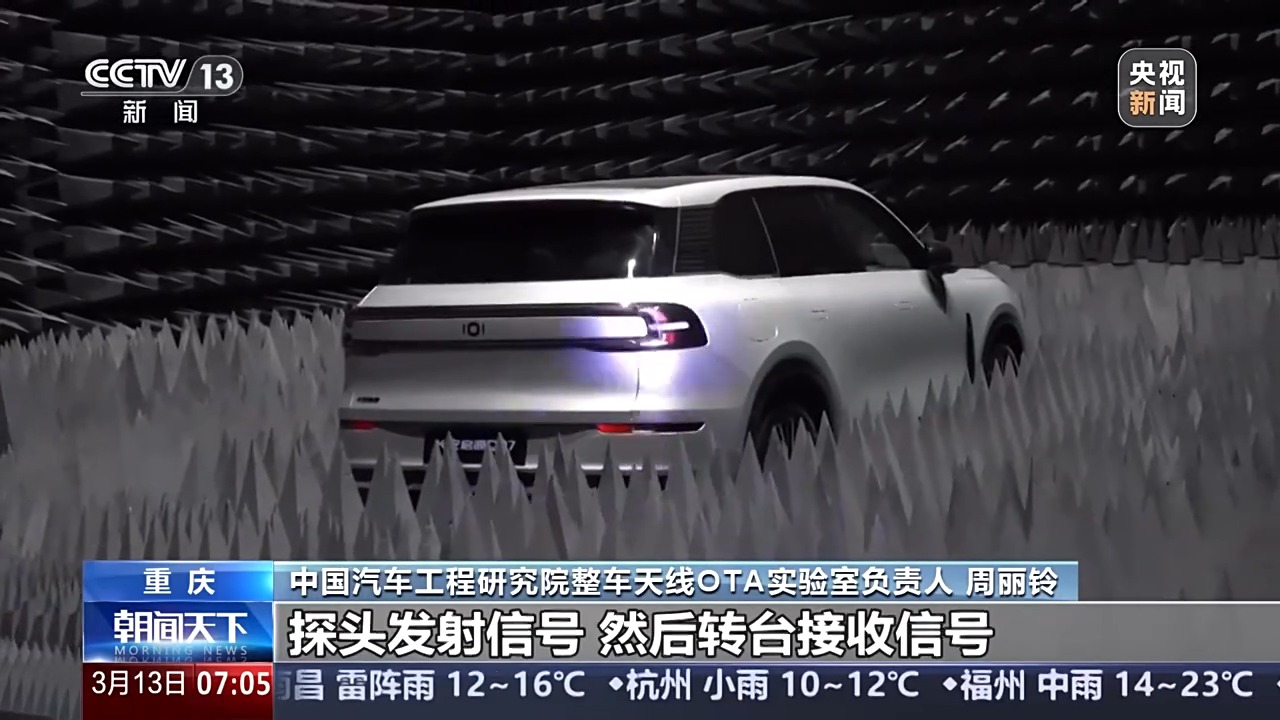 中國汽車工程研究院整車天線OTA實(shí)驗(yàn)室負(fù)責(zé)人 周麗鈴:這里是我們的一個(gè)探頭,然后配我們的轉(zhuǎn)臺(tái),探頭發(fā)射信號(hào),然后轉(zhuǎn)臺(tái)接收信號(hào),這樣的話就可以測(cè)汽車的接收性能,那它們互換一下就可以測(cè)汽車的一個(gè)發(fā)射的性能。