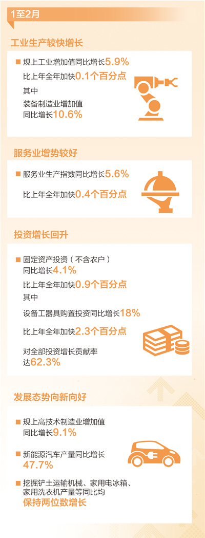 “兩新”政策加力擴圍,市場銷售回升、服務(wù)消費擴大。1至2月,社會消費品零售總額同比增長4%,比上年全年加快0.5個百分點。春節(jié)期間,國內(nèi)旅游出行人次同比增長5.9%。投資方面,制造業(yè)投資較快增長,基礎(chǔ)設(shè)施投資增速加快,帶動投資增長回升。1至2月,固定資產(chǎn)投資(不含農(nóng)戶)同比增長4.1%,增速比上年全年加快0.9個百分點。其中基礎(chǔ)設(shè)施投資增長5.6%,比上年全年加快1.2個百分點;制造業(yè)投資增長9%,明顯快于全部投資增長。