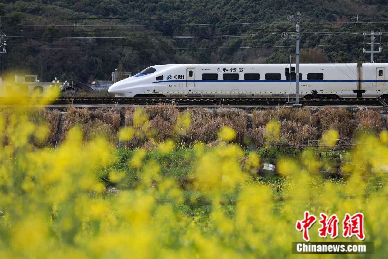 動(dòng)車組列車從貴廣高鐵黔東南州從江縣境內(nèi)的油菜花田旁駛過。中新社記者 瞿宏倫 攝