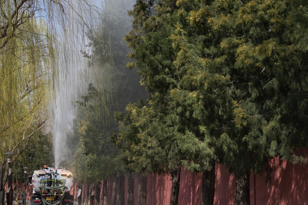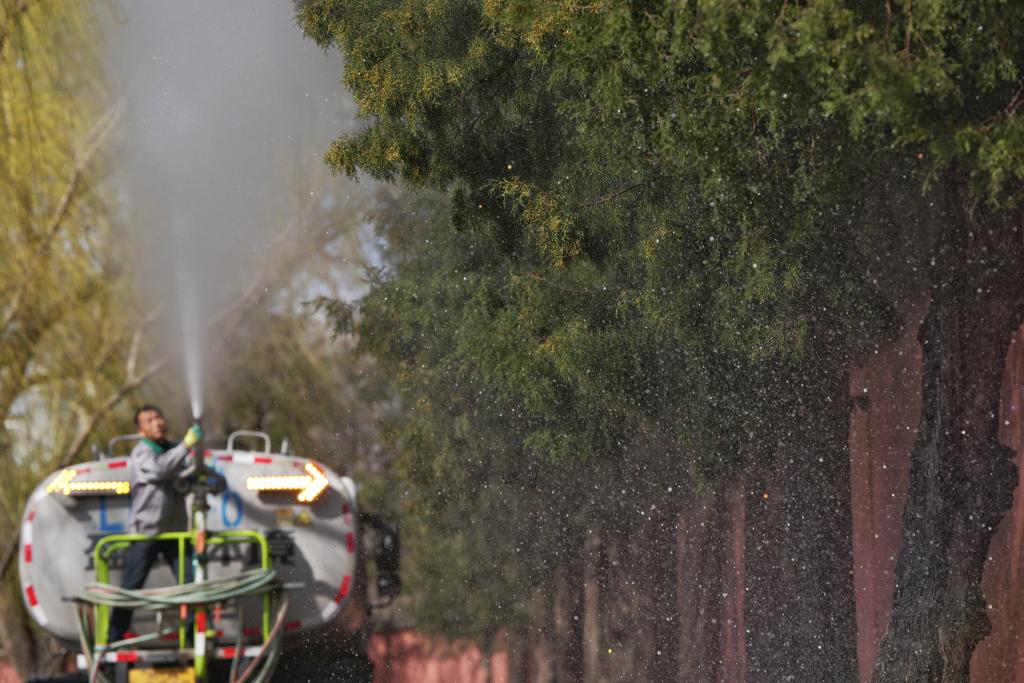 3月19日,北京園林工作人員操作高壓水槍,對(duì)圓柏進(jìn)行沖淋。新華社記者 鞠煥宗 攝