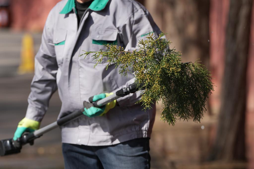3月19日,北京園林工作人員對(duì)開花較多的圓柏枝條進(jìn)行修剪。新華社記者 鞠煥宗 攝