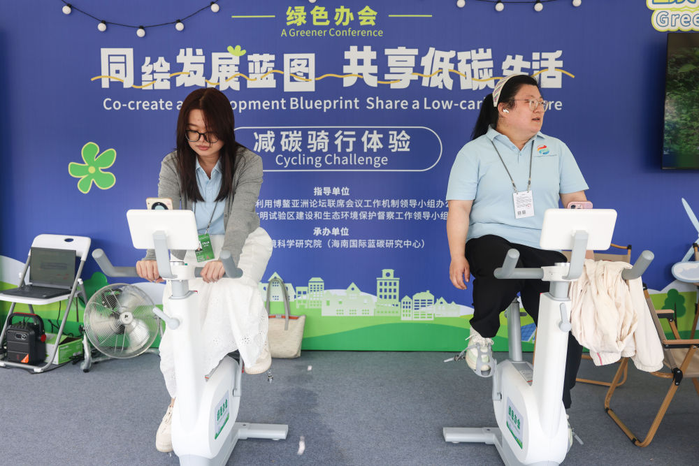 3月25日,參會(huì)人員在博鰲東嶼島文化公園內(nèi)體驗(yàn)減碳騎行活動(dòng)。