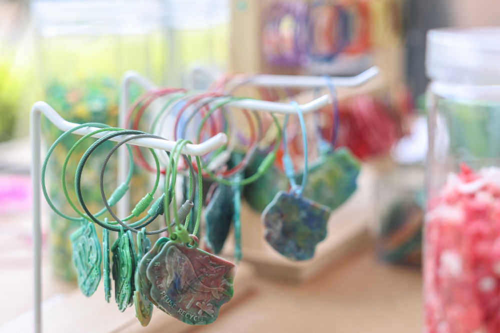 這是3月25日在博鰲亞洲論壇零碳休息區(qū)展示的使用廢棄塑料制作的鑰匙扣。