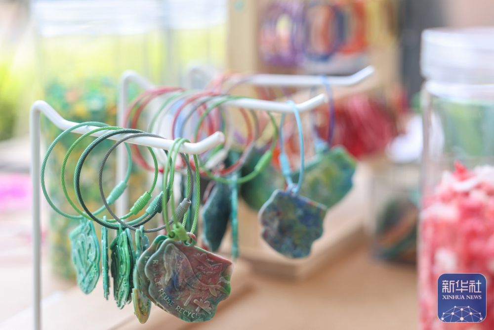 ↑ 這是3月25日在博鰲亞洲論壇零碳休息區(qū)展示的使用廢棄塑料制作的鑰匙扣。