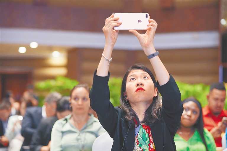 在全球自由貿(mào)易港發(fā)展論壇現(xiàn)場(chǎng),與會(huì)嘉賓用手機(jī)記錄。海南日?qǐng)?bào)全媒體記者 王程龍 攝