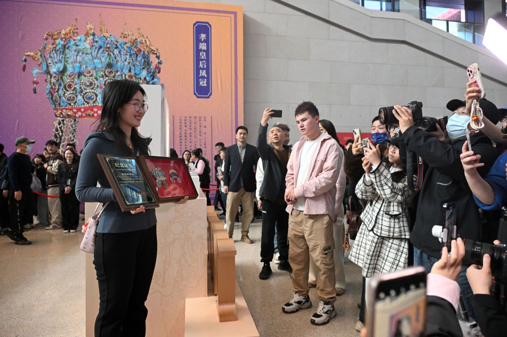 當(dāng)日,國博文創(chuàng)團(tuán)隊(duì)將“紀(jì)念款鳳冠冰箱貼”和紀(jì)念證書贈(zèng)送給第100萬件鳳冠冰箱貼的購買者——來自山東東營的“95后”觀眾李雅菲。