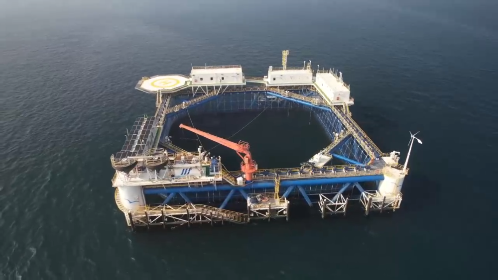 在距離大陸岸線42海里的海域坐落著這樣的深遠海智能網(wǎng)箱平臺,網(wǎng)箱長寬均為68米,布設500個監(jiān)測點,配備了聲納、激光雷達等設備。這樣的1個網(wǎng)箱每年能產(chǎn)出100萬條魚,只需要4個工人來操作。