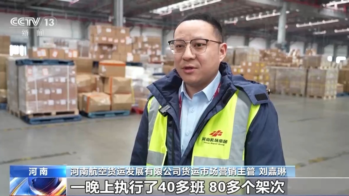 河南航空貨運發(fā)展有限公司貨運市場營銷主管 劉嘉琳:最繁忙的時候,一晚上執(zhí)行了40多班,80多個架次。每一個環(huán)節(jié)、每個時間節(jié)點我們都有監(jiān)控,哪個節(jié)點出現(xiàn)問題了,耽擱的時間比較長了,后臺對現(xiàn)場進(jìn)行提醒。高峰期加派人員,大大提高了作業(yè)效率。
