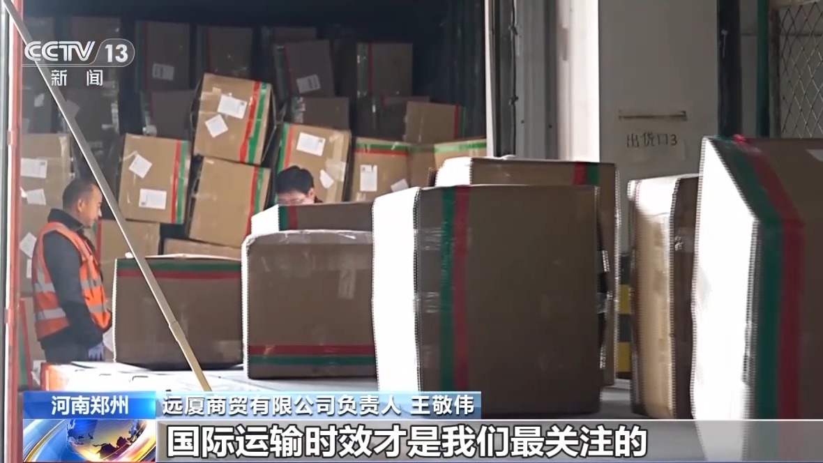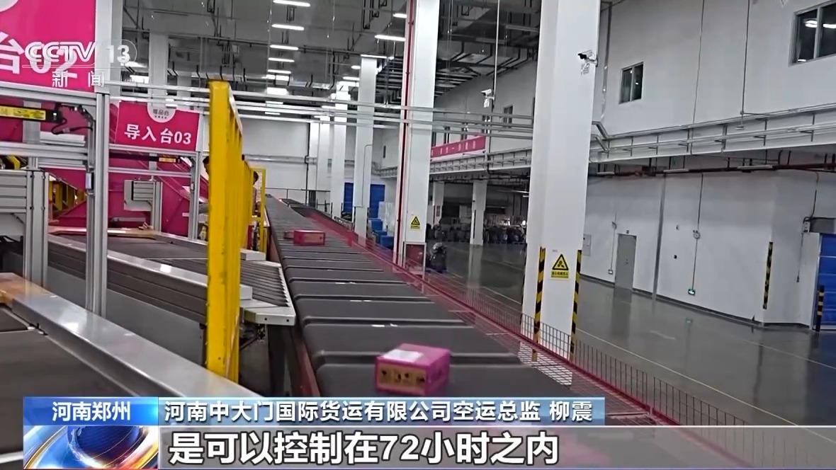 河南中大門國際貨運有限公司空運總監(jiān) 柳震:從國內(nèi)工廠提貨,到整個航班在境外口岸落地,我們整體的時效是可以控制在72小時之內(nèi),完全符合高效運轉(zhuǎn)的時效要求。