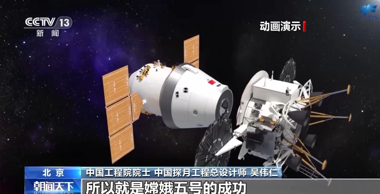中國工程院院士 中國探月工程總設(shè)計(jì)師 吳偉仁:當(dāng)時(shí)就想利用嫦娥五號(hào)來驗(yàn)證我們后續(xù)載人登月技術(shù),載人登月就是在軌道上交會(huì)對(duì)接,然后人下去探測,探測完后月面起飛,在軌道上交會(huì)對(duì)接,然后人再進(jìn)入返回器,返回器再和軌道器脫離,脫離過后,返回器把人送回地球。所以嫦娥五號(hào)的成功,為未來我們載人登月奠定基礎(chǔ),幾乎把所有的關(guān)鍵技術(shù)都驗(yàn)證了一遍。