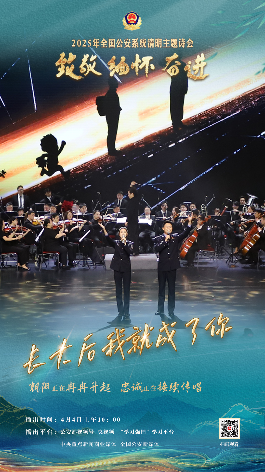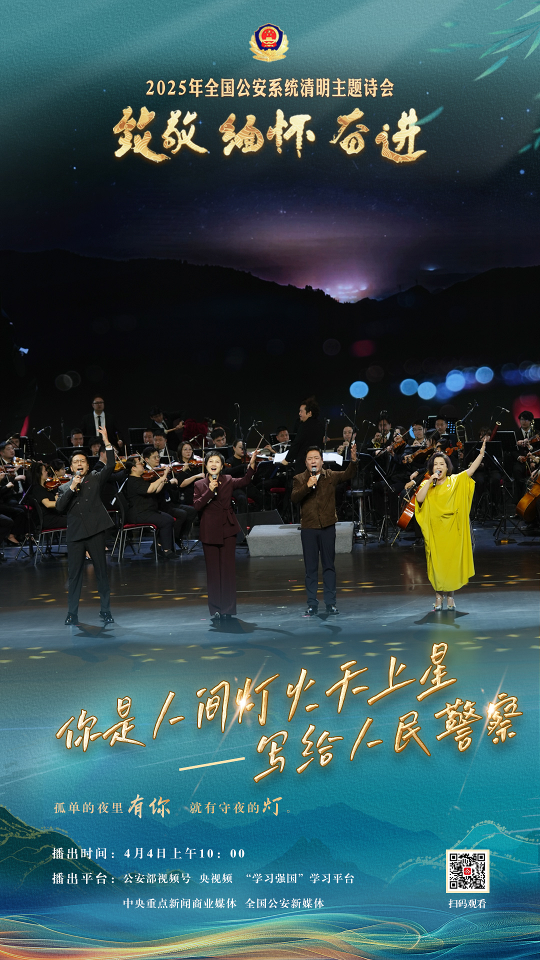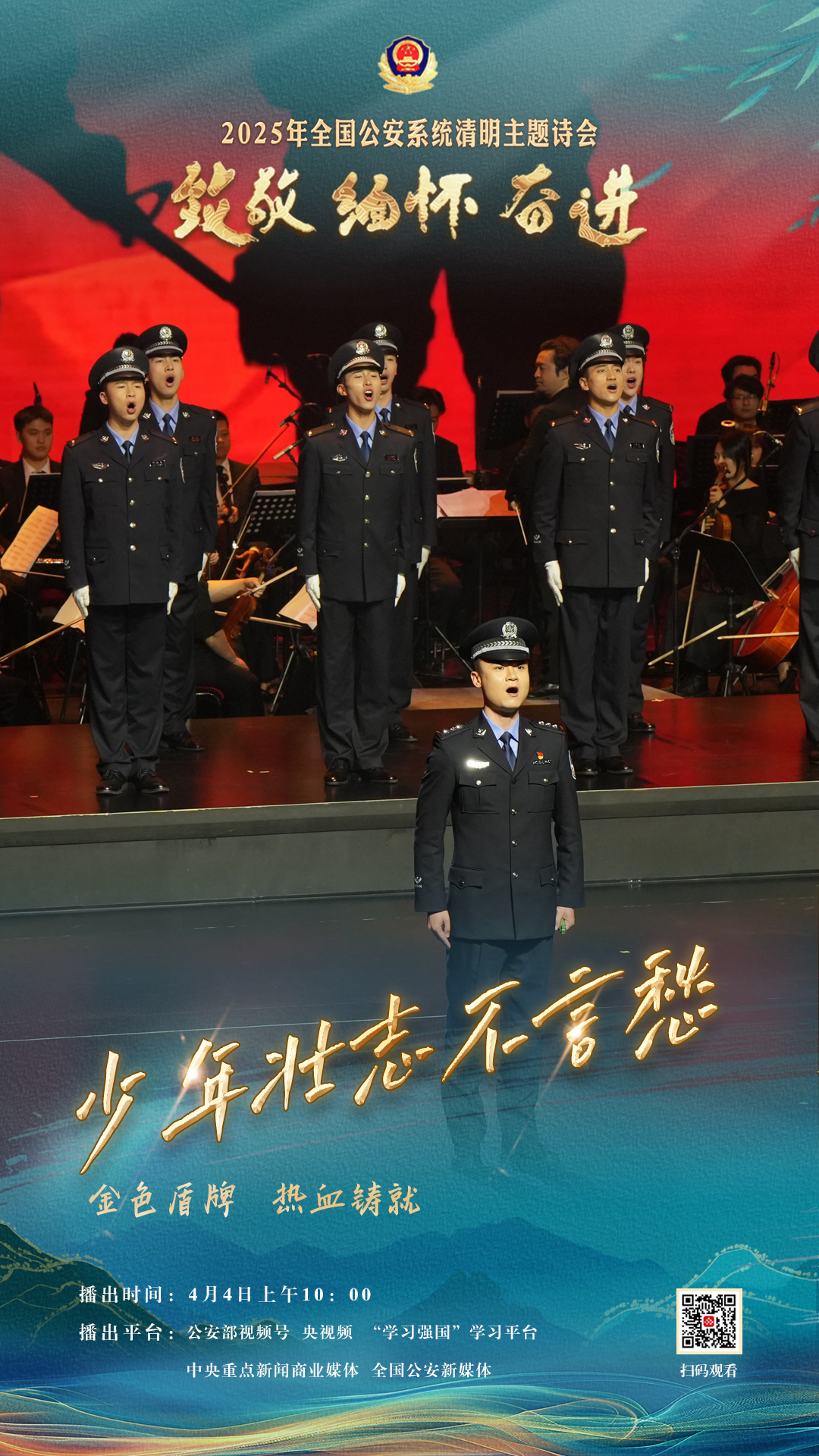 為充分展現(xiàn)全國公安機關(guān)和廣大公安民警、輔警時刻銘記習近平總書記的關(guān)心關(guān)懷,時刻為黨和人民而戰(zhàn)的忠誠政治本色,深情追憶一年來公安系統(tǒng)涌現(xiàn)的英雄模范感人事跡,激勵引導(dǎo)廣大公安民警以更加奮發(fā)有為的精神面貌,堅決履行好黨和人民賦予的神圣職責使命,今年清明節(jié)當天,公安部新聞宣傳局、全國公安文聯(lián)、四川省公安廳聯(lián)合舉辦“致敬·緬懷·奮進”2025年全國公安系統(tǒng)清明主題詩會。