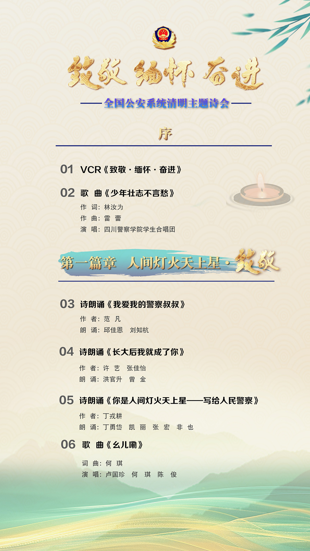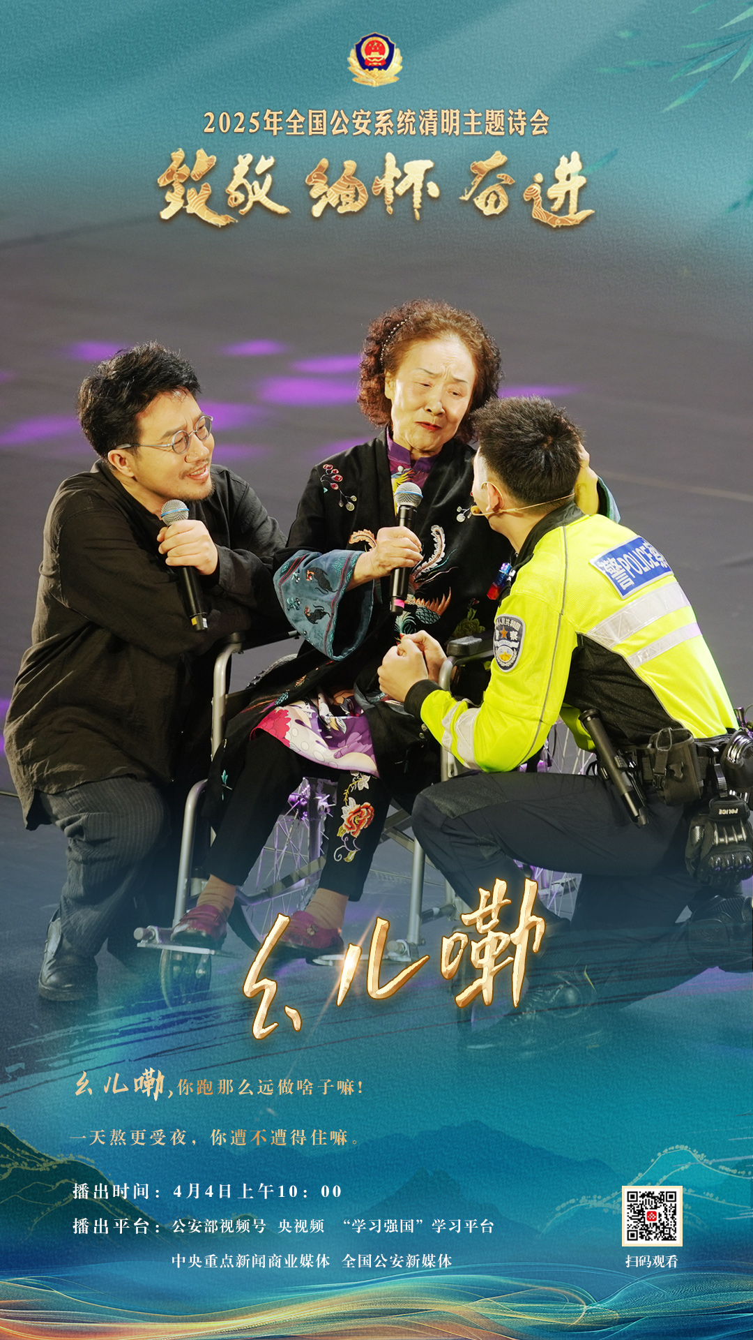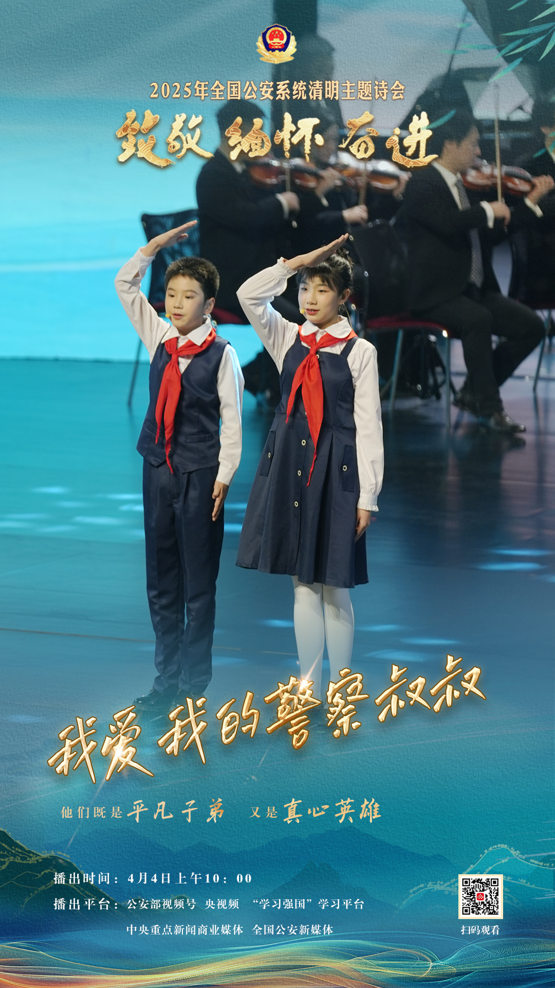 為充分展現(xiàn)全國公安機關(guān)和廣大公安民警、輔警時刻銘記習近平總書記的關(guān)心關(guān)懷,時刻為黨和人民而戰(zhàn)的忠誠政治本色,深情追憶一年來公安系統(tǒng)涌現(xiàn)的英雄模范感人事跡,激勵引導(dǎo)廣大公安民警以更加奮發(fā)有為的精神面貌,堅決履行好黨和人民賦予的神圣職責使命,今年清明節(jié)當天,公安部新聞宣傳局、全國公安文聯(lián)、四川省公安廳聯(lián)合舉辦“致敬·緬懷·奮進”2025年全國公安系統(tǒng)清明主題詩會。