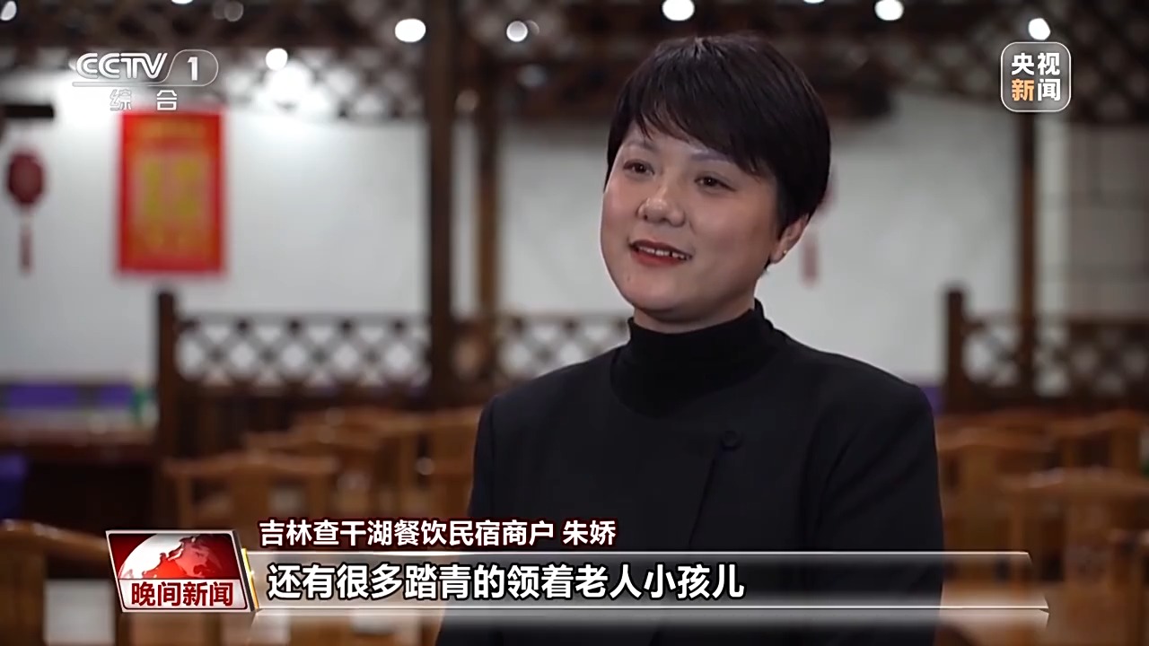 吉林查干湖餐飲民宿商戶 朱嬌:很多攝影愛好者到查干湖來拍冰面上的候鳥嬉戲,還有很多踏青的領著老人小孩兒到查干湖來游玩,我們的餐飲訂單量有所上漲。