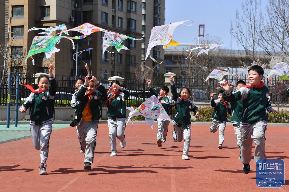 ↑ 4月3日,山東省臨沂市郯城縣第一實(shí)驗(yàn)小學(xué)學(xué)生在操場上放風(fēng)箏。新華社發(fā)(張春雷攝)