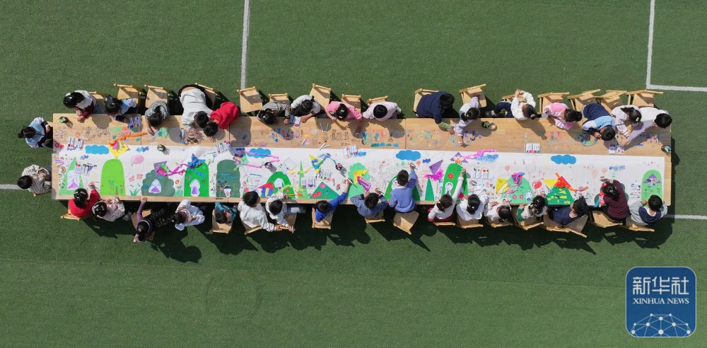 ↑ 4月3日,山東省鄒平市高新街道中心幼兒園的小朋友在繪制清明長卷(無人機(jī)照片)。新華社發(fā)(董乃德攝)