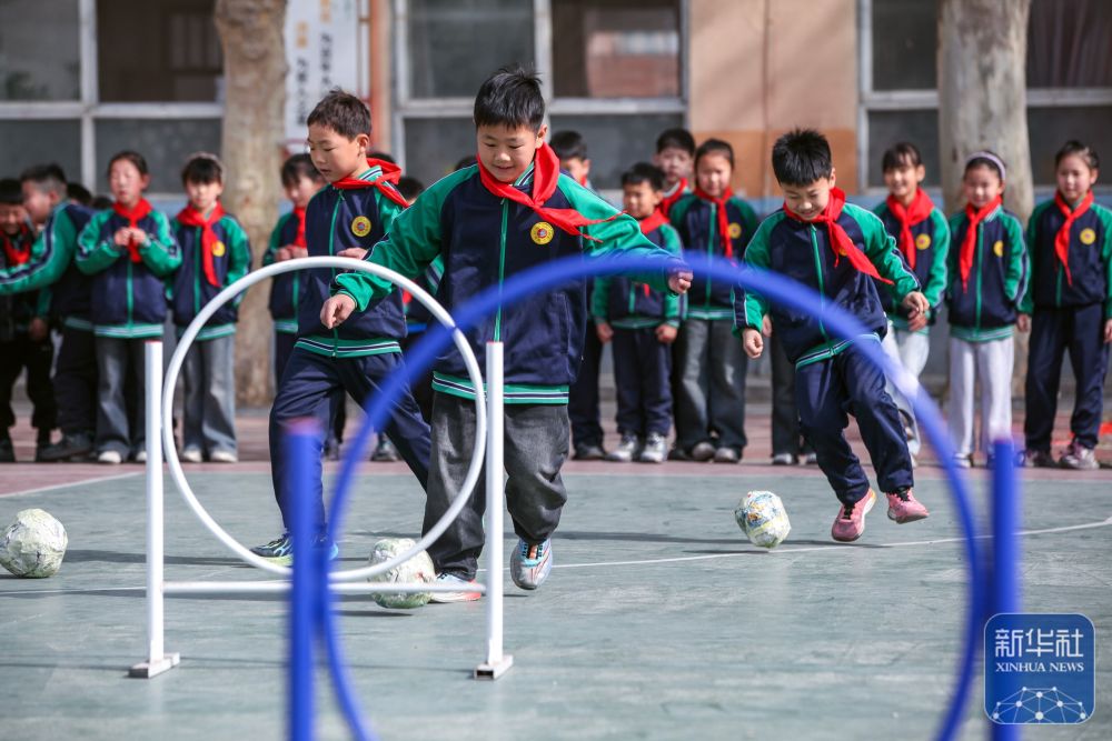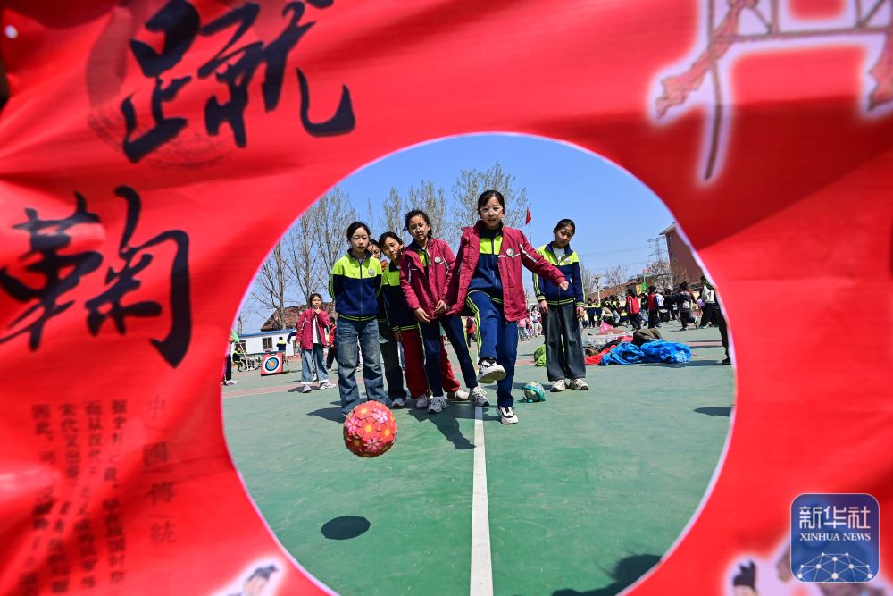 ↑ 4月3日,在河南省焦作市博愛縣清化鎮(zhèn)街道七街小學(xué),學(xué)生們?cè)隗w驗(yàn)蹴鞠。新華社發(fā)(程全攝)